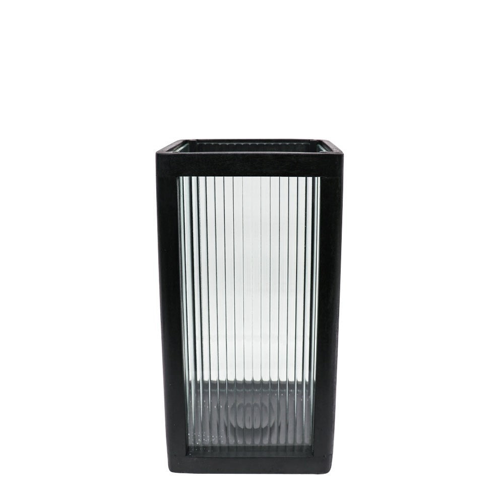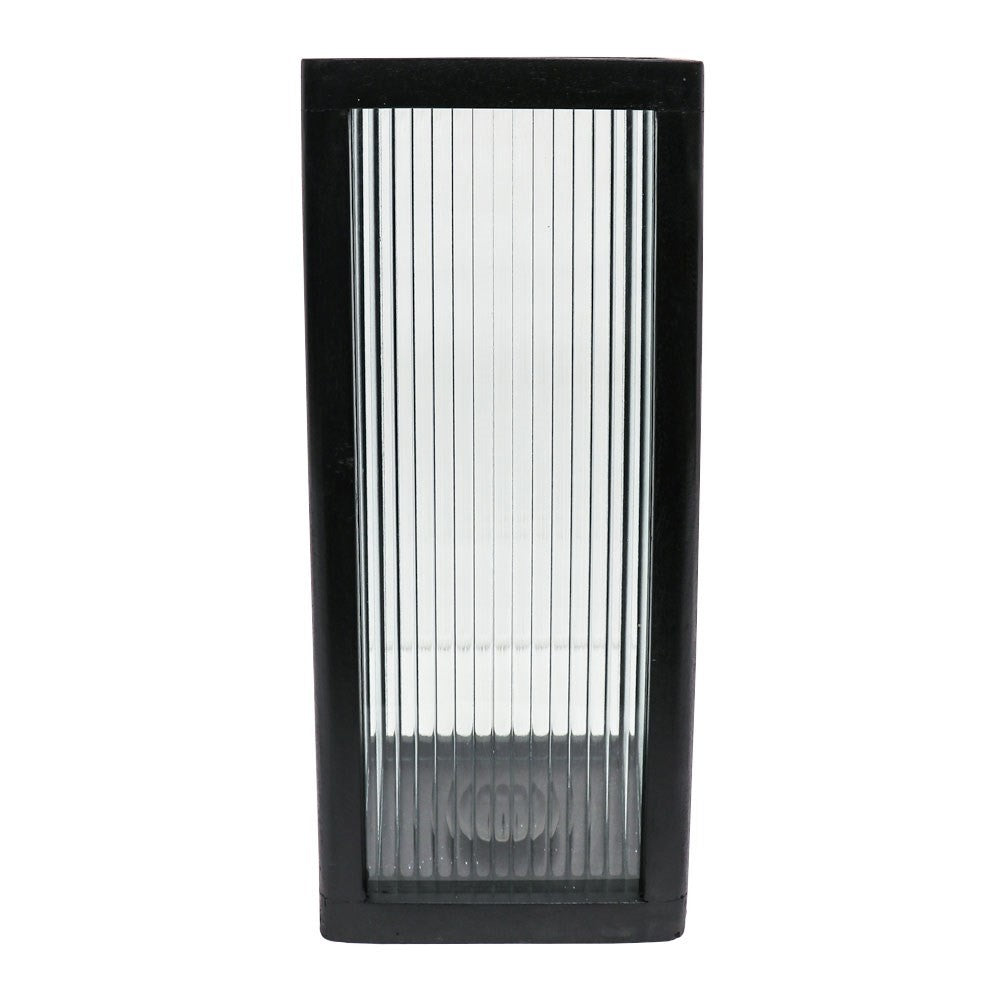 Beautiful Mango wood stained black with reeded glass in this Hurricane Lantern. Great mood lighting...