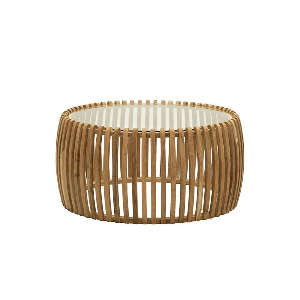 Crafted from teak with tempered glass. Knots, slight cracking, blemishes, small dents and minor colour...