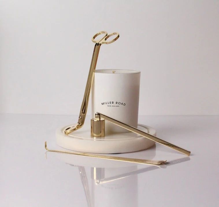 The Candle Care set includes everything you need to prolong the life of your candles. With this kit, you can easily trim wicks, clean and maintain candle jars, and extinguish flames safely. Keep your candles burning brightly and cleanly with this essential accessory.