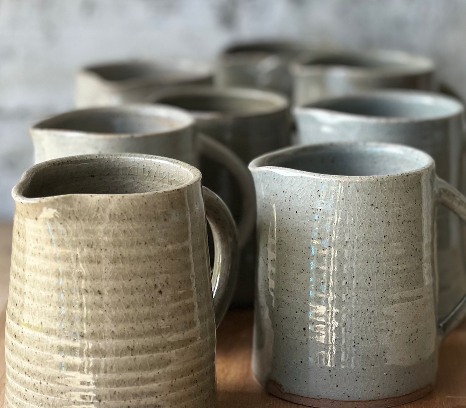 Small gas fired jug in a green glaze. 95mm tall x 70mm wide (not including handle).