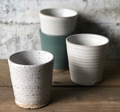 Speckled stoneware tumbler in a cream matte glaze. Measures approximately 8.5cm wide x 9cm tall.