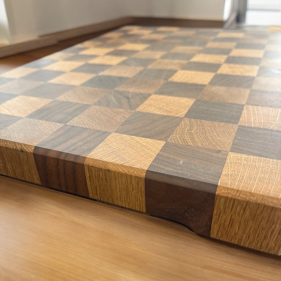 This oak and walnut checker chopping board is crafted from high-quality, durable materials. The unique checker pattern not only adds a touch of elegance to your kitchen but also provides a sturdy and level surface for chopping and food prep. Upgrade your cooking experience with this expertly-designed chopping board.