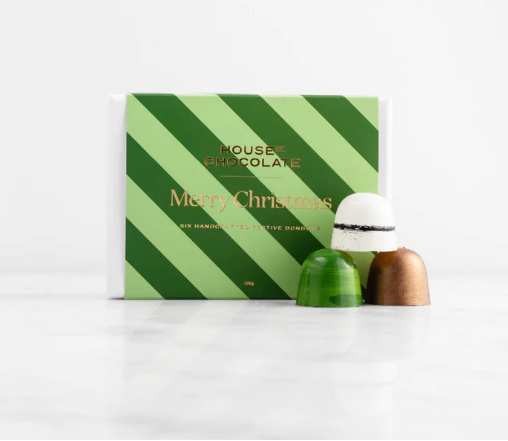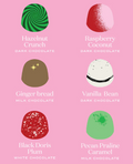 Indulge in the taste of Christmas with our handcrafted festive bonbon selection. Made with Kiwi summer ingredients, our six limited edition flavors - Hazelnut Crunch, Raspberry Coconut, Gingerbread, Vanilla Bean, Black Dorris Plum, and Pecan Praline Caramel - are the perfect gift for any food lover. Treat yourself or a loved one to this 100g pack of joy. Contains dairy, wheat, hazelnuts, pecans, and soya.