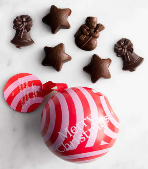 Indulge in our festive Christmas chocolates, featuring a keepsake tin bauble filled with decadent 55% dark chocolate stars, snowmen, and novelties. Handmade in our sustainable Auckland chocolate kitchen, this 100g pack is perfect for gifting or decorating your tree. Dairy and gluten free, contains soya.