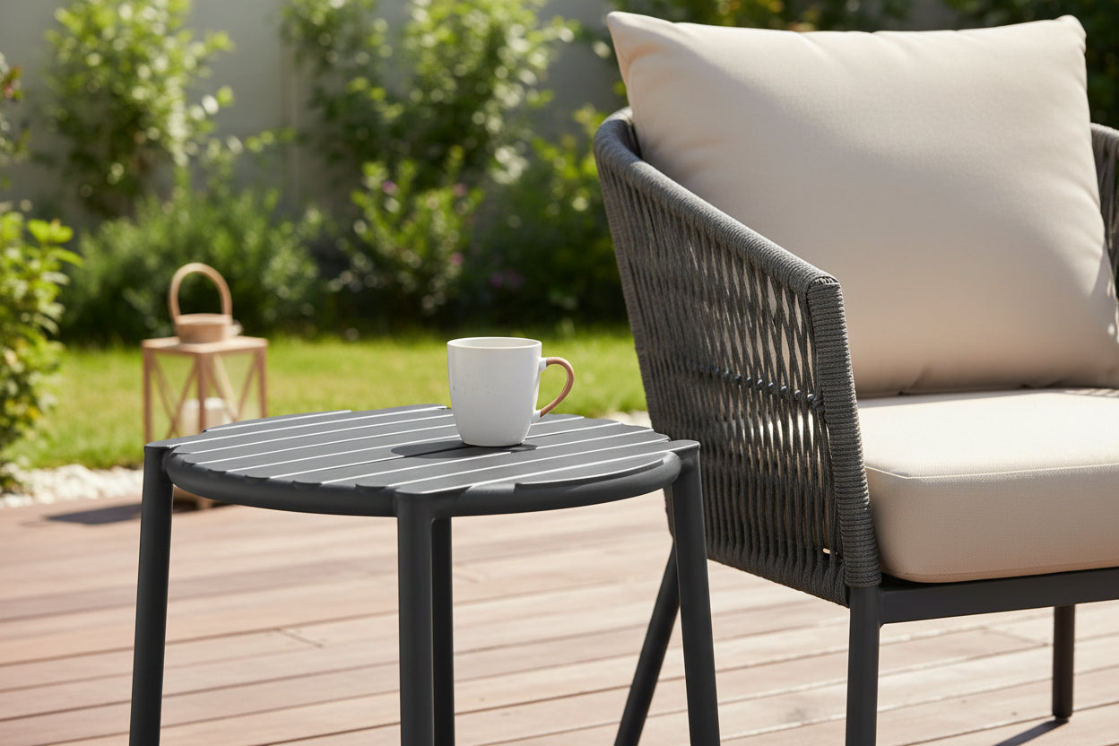 Compact, low-maintenance & easy to clean, the Doga Coffee Table is a fresh & simple monobloc outdoor side table that features a slatted table top design. Manufactured in Italy by NARDI with Polypropylene & Fiberglass resin that’s commercial grade and UV resistant. Availaible in Charcoal, White, Olive Green, Marsala, Mint, Pear