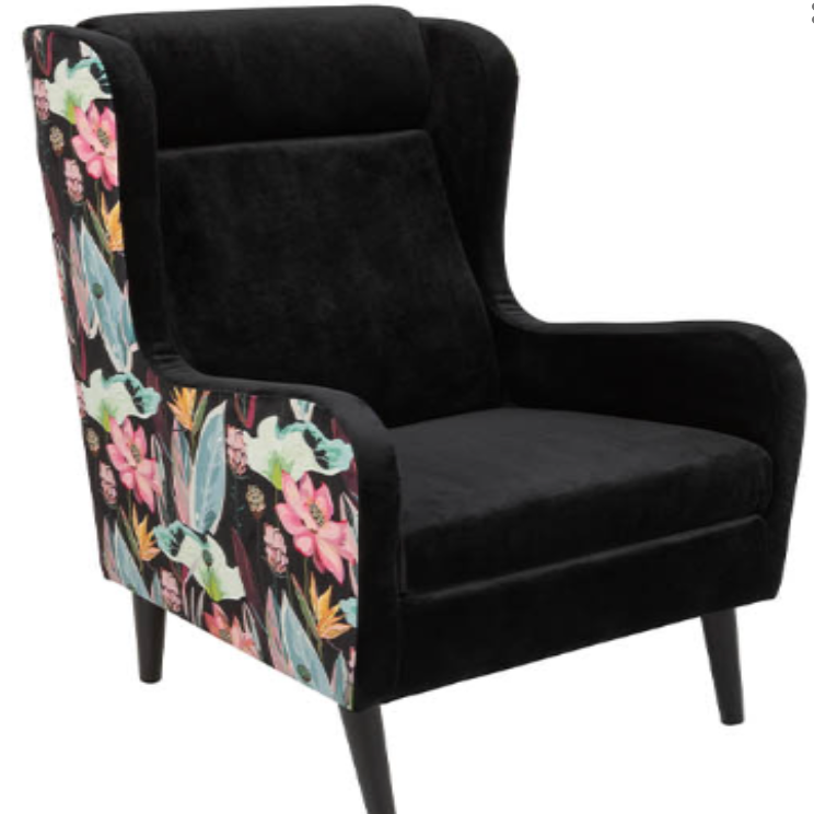 The Geta Lotus Chair features a sleek black velvet design with a stunning lotus print. Crafted with comfort and style in mind, elevate your space with this eye-catching chair.