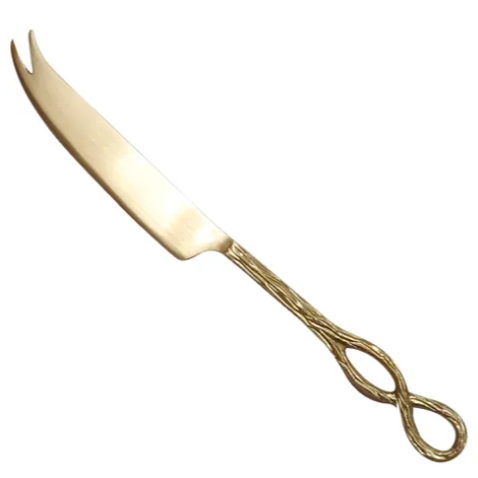 Introducing the Infinity Cheese Knife! Crafted with a stylish and durable brush gold finish, this knife effortlessly slices through all types of cheese. Its innovative design allows for precise cuts, making any cheese platter a work of art. Elevate your dining experience with this professional-grade knife.