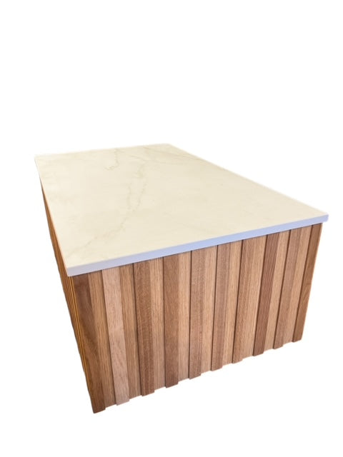 This Coffee table is hand crafted in our local factory. Made from American white oak veneer and solid American white oak strips. The top is 20mm Deckton Rem.