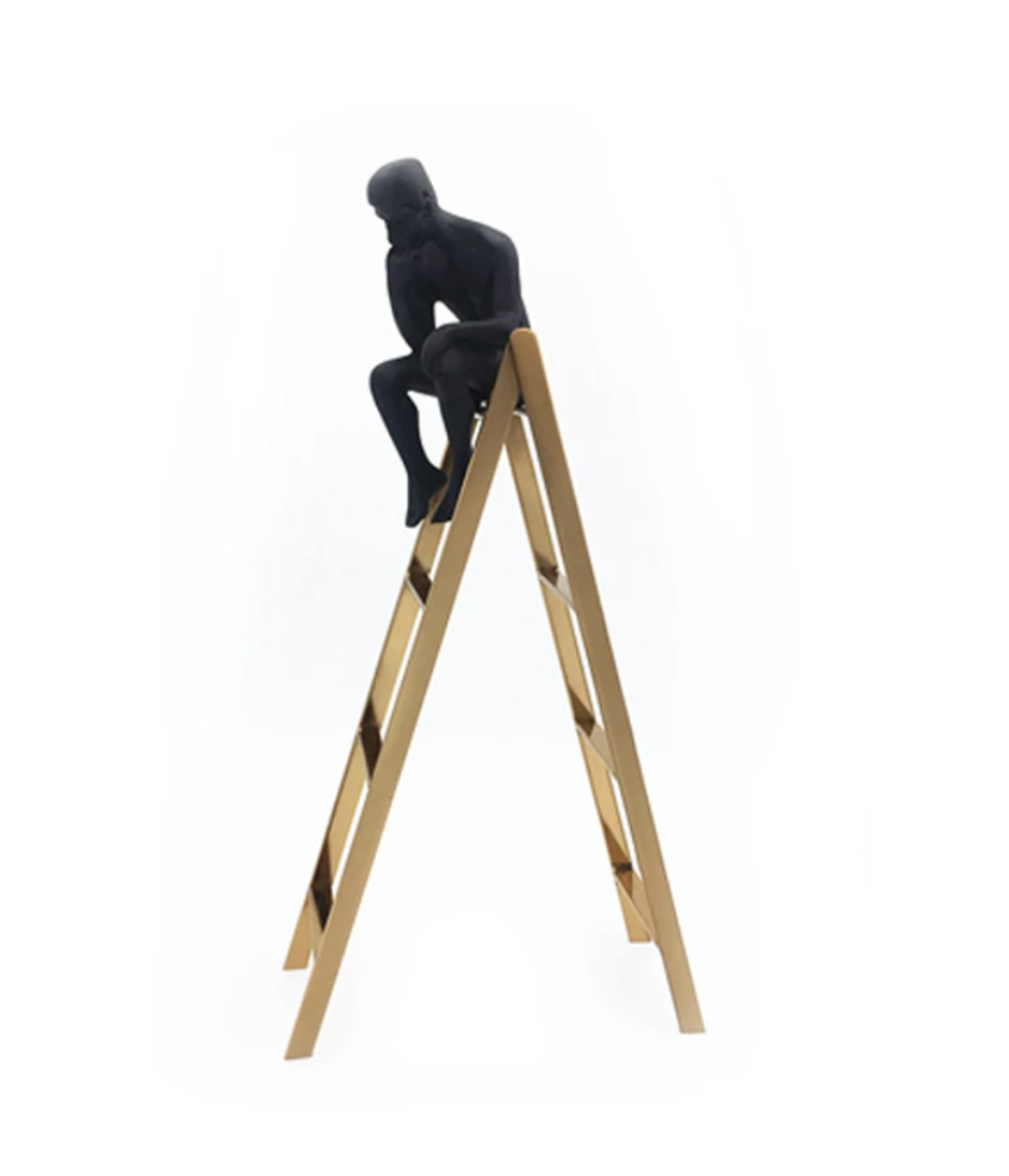 Elevate your decor with the symbolic Thinking Man on a Ladder. Crafted from metal, this statue represents deep contemplation and determination. The ladder serves as a reminder of the journey towards success and the mindset required to reach new heights. Perfect for inspiring and adding a touch of sophistication to any space.